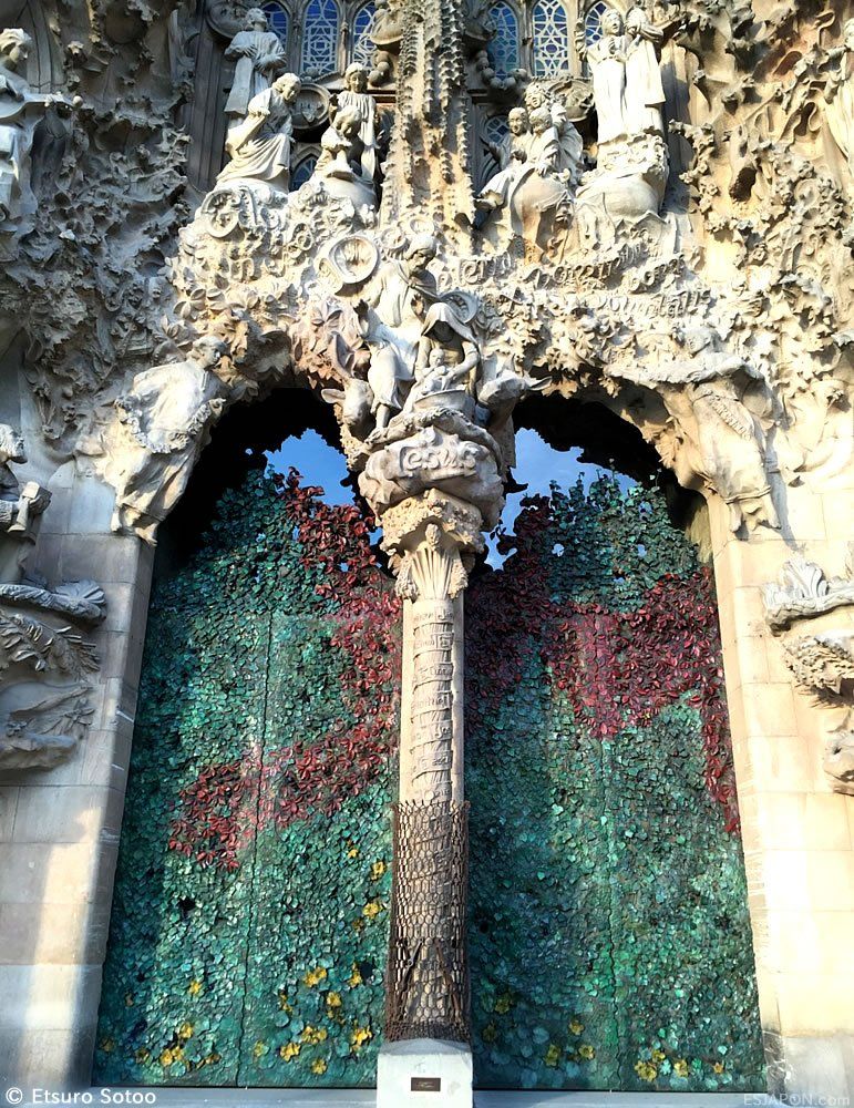 La fachada del Nacimiento es la única parte del templo directamente construida por Gaudí, que murió trágicamente antes de verla acabada, pero Sotoo lo hizo, casi 100 años después de su muerte. La fachada del Nacimiento de la Sagrada Familia ha sido declarada "PATRIMONIO DE LA HUMANIDAD" por la UNESCO en el año 2.005, junto a la cripta donde descansan los restos de Gaudí. Las cuatro puertas de esta fachada fueron construidas y diseñadas por Etsuro Sotoo, asi como los Angeles músicos y los niños cantores.