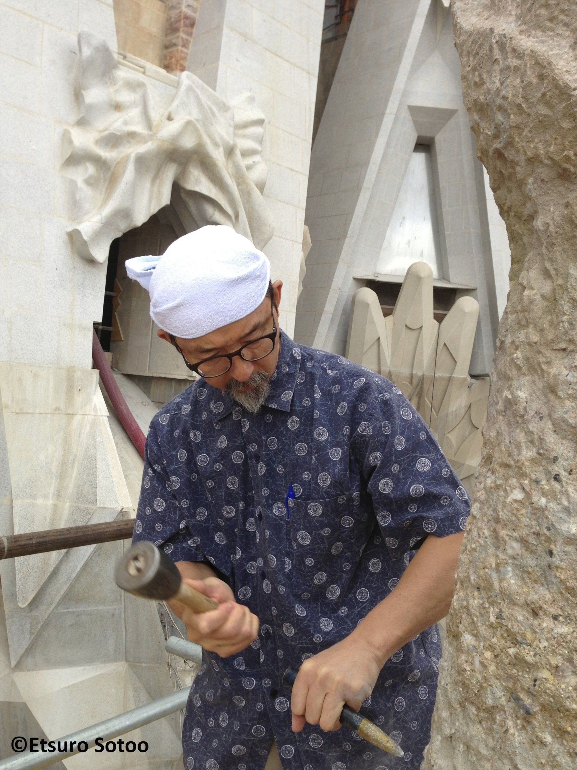En el año 1.978 Etsuro Sotoo, llegó a Barcelona. Se acababa de licenciar en Bellas Artes, tenía apenas un año de experiencia como profesor de Arte. Cuando le impresionó el templo inacabado: "Era el montón de piedras más fabuloso que jamás había visto"... Pidió trabajo como picapedrero. Quería continuar la fachada del Nacimiento (la única fachada que, gracias a su trabajo, sería declarada por la Unesco Patrimonio Mundial). Hizo una prueba y le dieron el puesto. Desde entonces completa lo que Gaudí no tuvo siquiera tiempo de pensar. Cuando acabó con los huecos comenzó con los apuntes del arquitecto. Cuando se han acabado las pistas le ha tocado tomar decisiones.